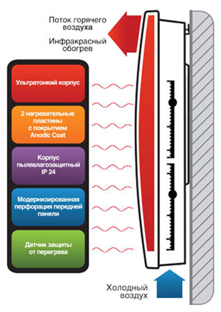 Процесс обогрева помещения происходит следующим образом: холодный воздух поступает в конвекционную камеру через воздухозаборник. Далее воздух проходит через систему нагревательных пластин. Нагревательные пластины испускают инфракрасные лучи, которые нагревают предметы в помещении. В конвекционной камере воздух, нагреваясь, поднимается наверх и выходит через воздуховыпускные решетки.