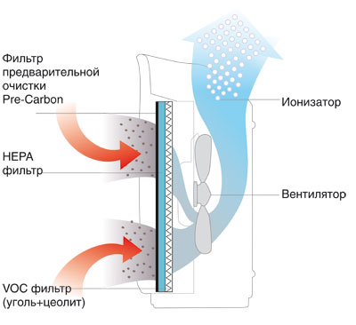 С помощью вентилятора воздушный поток проходит через Pre-Carbon фильтр, задерживающий относительно крупные частицы. Затем воздух проходит через HEPA-фильтр, задерживающий пыльцу, аллергены и прочие частицы размером до 0,3 мкм. Далее VOC-фильтр 2 в 1 (угольный фильтр + цеолит), абсорбирует и впитывает неприятные запахи, химические соединения, такие как CO2, формальдегид, фреон. Завершает очистку воздуха ионизатор, который генерирует необходимое количество отрицательных ионов и очищает воздух в помещении. Ионы соединяют частицы пыли между собой в более крупные кластеры, которые лучше улавливаются фильтром, что дополнительно усиливает эффект очистки.