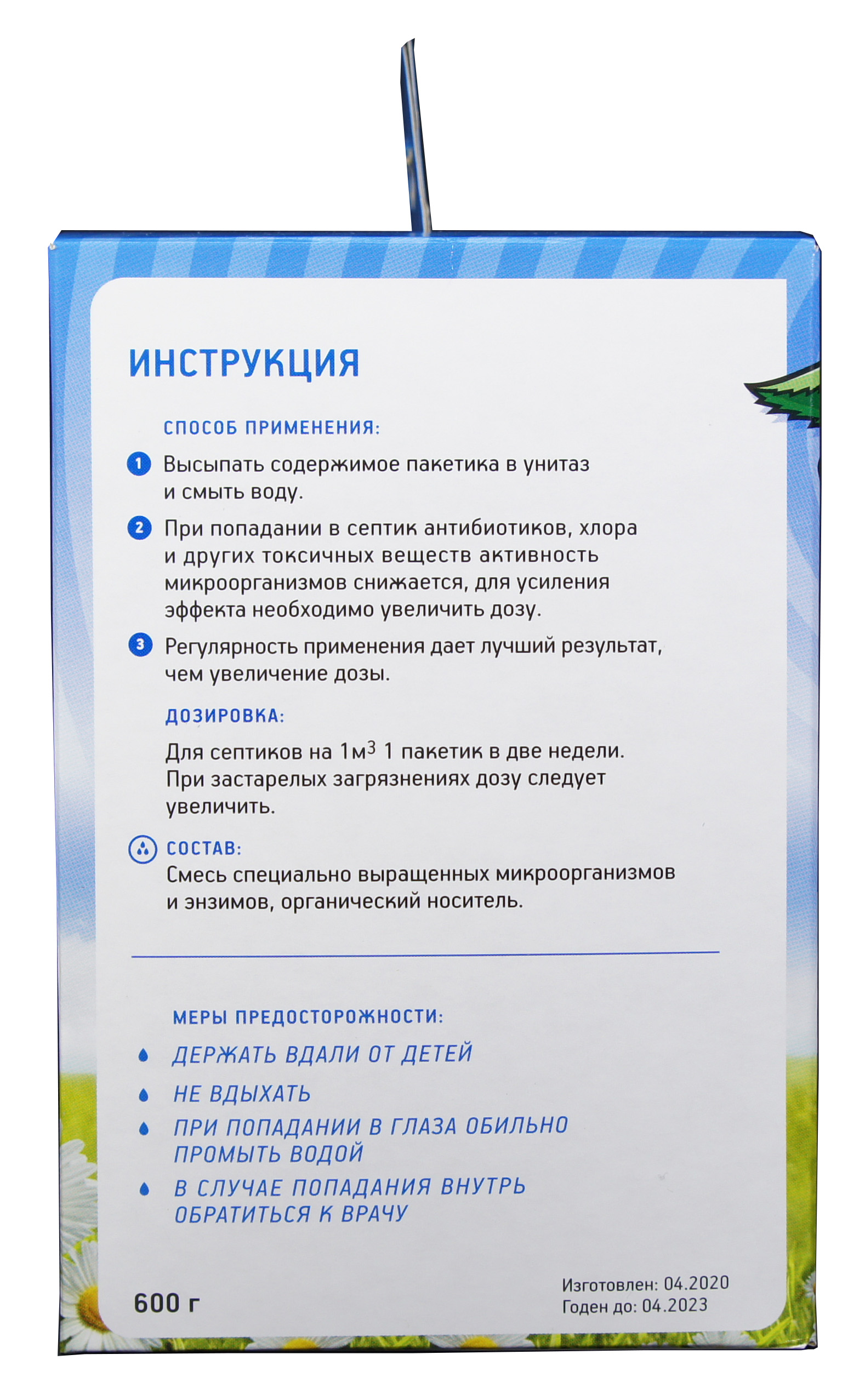 Биосепт - это порошкообразный препарат, состоящий из живых клеток специально подобранных и отселекционированных микроорганизмов, а также ферментов, в сотни раз ускоряющих процессы распада фекалий и трудно разлагаемых соединений, таких как жиры, целлюлоза, поверхностно-активные вещества. В результате практически сразу же исчезает неприятный запах, образуются вода, углекислый газ и минеральный осадок. Поскольку препарат содержит и аэробные и анаэробные бактерии, он применим для конструкций, содержащих и не содержащих кислород