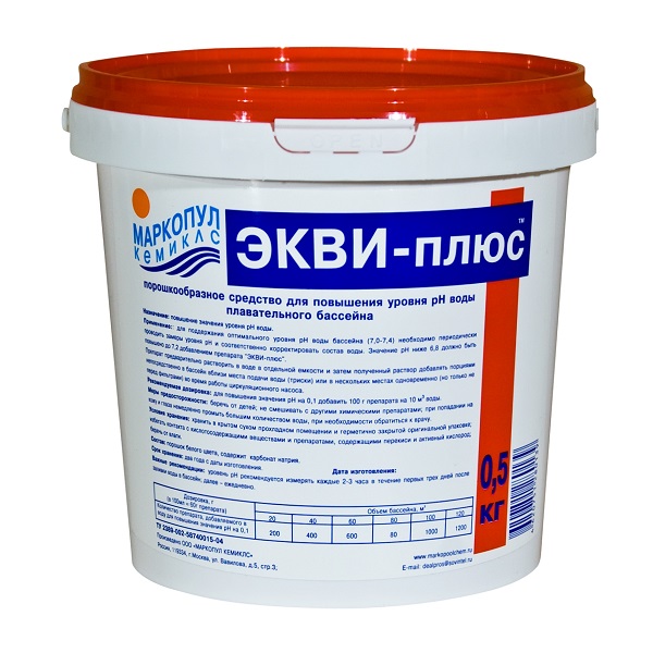 Порошкообразное средство Экви-плюс предназначено для повышения кислотно-щелочного баланса водной среды в плавательных бассейнах до нормального уровня. При своевременном использовании средство поможет избежать образования известкового налета на плитке.