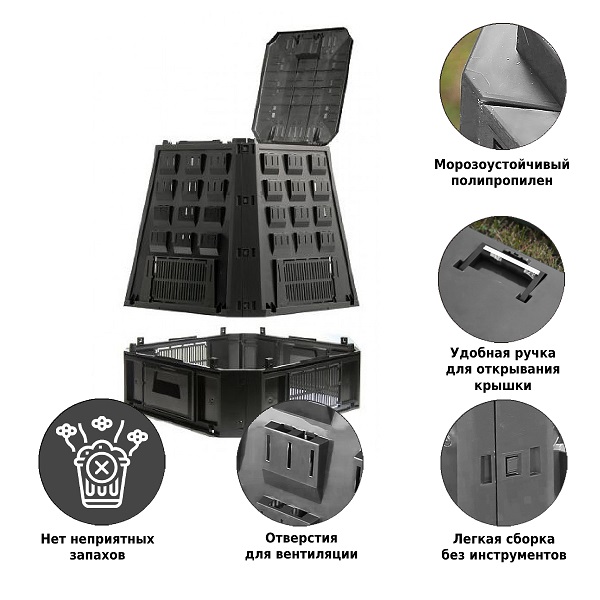 Компостер Prosperplast Biocompo IKEV630C-S411 это пластиковый ящик в форме пирамиды с крышкой и закрывающимся боковым отверстием для извлечения компоста. Он сделан из пластика с учетом всех требований для производства качественного органического удобрения. Компостер держит тепло и имеет отверстия для вентиляции, что значительно ускоряет процесс компостирования. Небольшие отверстия облегчают приток воздуха, а закрытая форма делает невозможным доступ животных к хранящихся отходов. Благодаря откидной створки в нижней части компостера, есть доступ к готовому компосту.