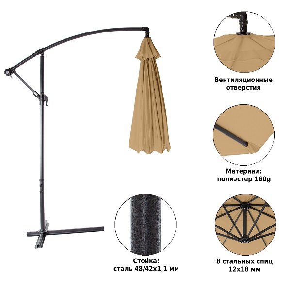 В комплекте с зонтом идет основание – крестовина, на которую для устойчивости зонта можно установить бетонные утяжелители (в комплект не входят) или привернуть ее через имеющиеся отверстия к полу.