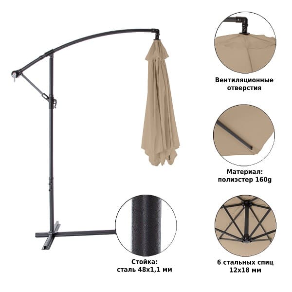 В комплекте с зонтом идет основание – крестовина, на которую для устойчивости можно установить бетонные утяжелители (в комплект не входят) или привернуть ее через имеющиеся отверстия к полу.
