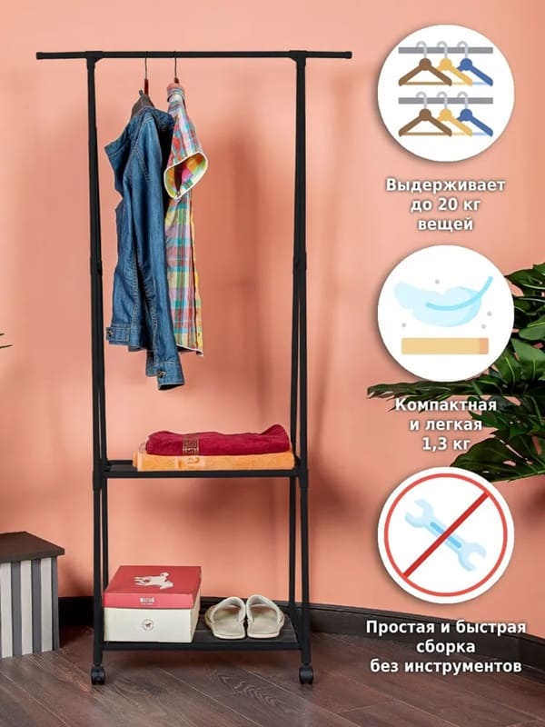 Напольная вешалка для одежды станет современной заменой шкафу и поможет в хранении самых разных вещей. Она организует пространство в прихожей, детской, гардеробной, спальне, коридере, ванной комнате или на балконе. Стойка перемещается на пластиковых колесиках, она передвижная и многофункциональная.На перекладину помещается больше 10 плечиков с брюками, юбками, рубашками, штанами, футболками, шарфами, платками и верхней одеждой. А под штангой есть большая полка для хранения обуви в чехлах и полочка для сумок и органайзеров для белья.