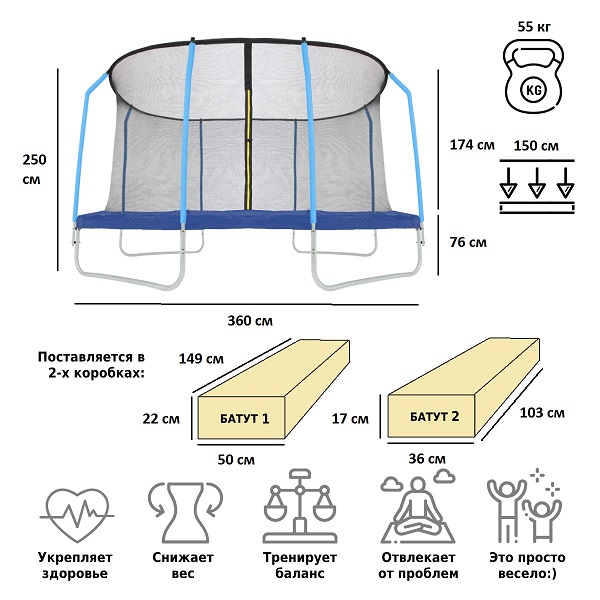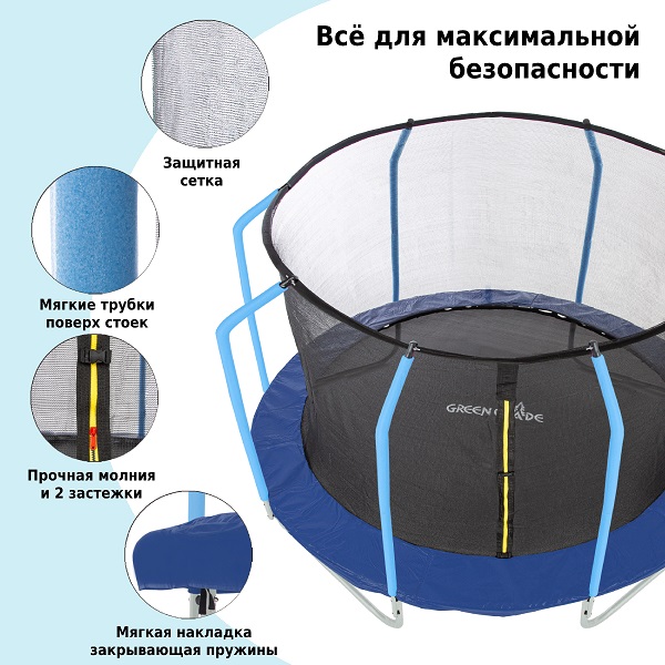 Green Glade B122 имеет просторные размеры: диаметр 366 см, высота 250 см. Во время прыжков человека защищает прочная сетка. Материал прыжковой зоны – прочный ПВХ. Батут используется для детей старше шести лет и взрослых. Выдерживает вес до 150 кг.