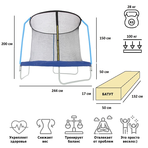 Детский батут с защитной сеткой для отдыха на даче или во дворе частного дома. Имеет компактные размеры: диаметр 244 см, высота 220 см. Во время прыжков ребенка защищает прочная сетка. Материал прыжковой зоны – сверх прочный полипропилен. Используется батут для детей старше шести лет. выдерживает вес до 75 кг