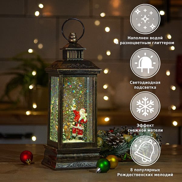 Декоративный новогодний фонарь Winter Glade станет ярким украшением дома в период новогодних и рождественских праздников. Работает фонарь от 3 пальчиковых батареек типа АА (в комплект не входят), USB шнура (входит в комплект) или сети 220V (адаптер в комплект не входит). Фонарь имеет 2 рабочих режима: 1 - подсветка, механизм мерцания, кружится снег и начинают играть по очереди 8 мелодий; 2 -подсветка + механизм мерцания без музыки.