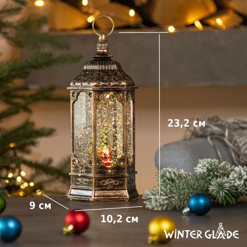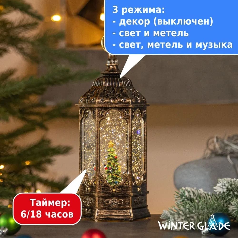 Декоративный новогодний фонарь Winter Glade станет ярким украшением дома в период новогодних и рождественских праздников. Работает фонарь от 3 пальчиковых батареек типа АAА (в комплект не входят), USB шнура (входит в комплект) или сети 220V (адаптер в комплект не входит). Фонарь имеет 2 рабочих режима: 1 - подсветка, механизм мерцания, кружится снег и начинают играть по очереди 8 мелодий; 2 - подсветка + механизм мерцания без музыки.