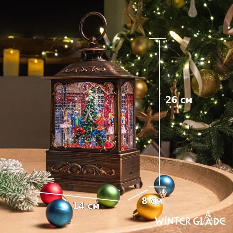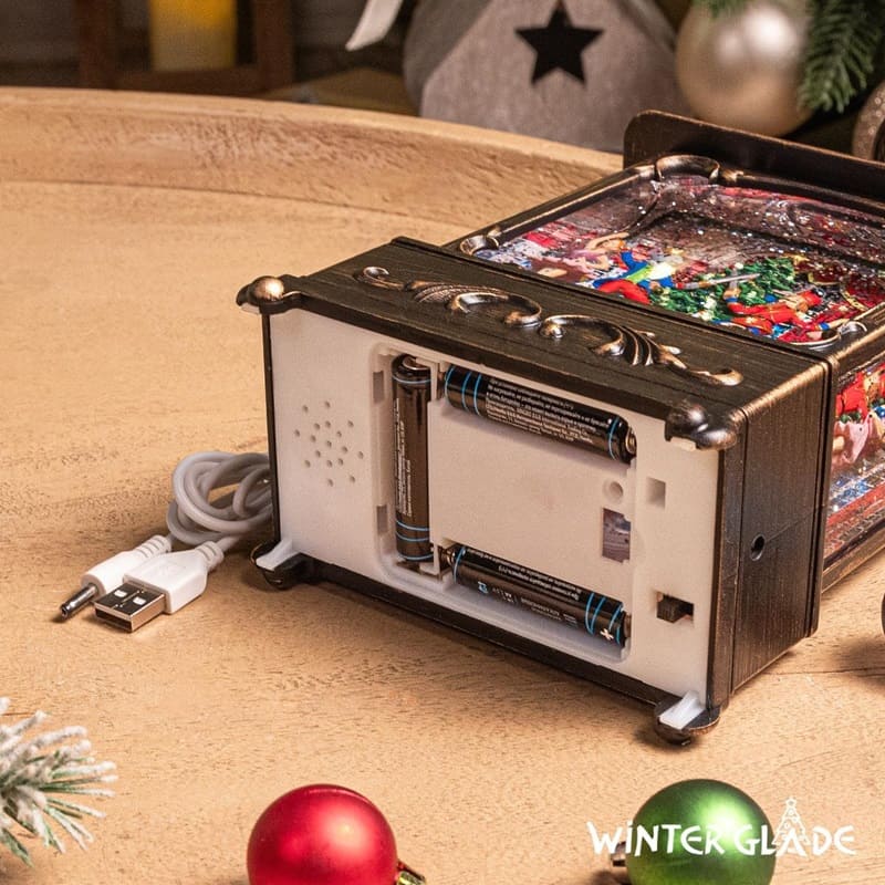 Декоративный новогодний фонарь Winter Glade станет ярким украшением дома в период новогодних и рождественских праздников. Работает фонарь от 3 пальчиковых батареек типа AА (в комплект не входят), USB шнура (входит в комплект) или сети 220V (адаптер в комплект не входит). Фонарь имеет 2 рабочих режима: 1 - подсветка, механизм мерцания, кружится снег и начинают играть по очереди 8 мелодий; 2 - подсветка + механизм мерцания без музыки.