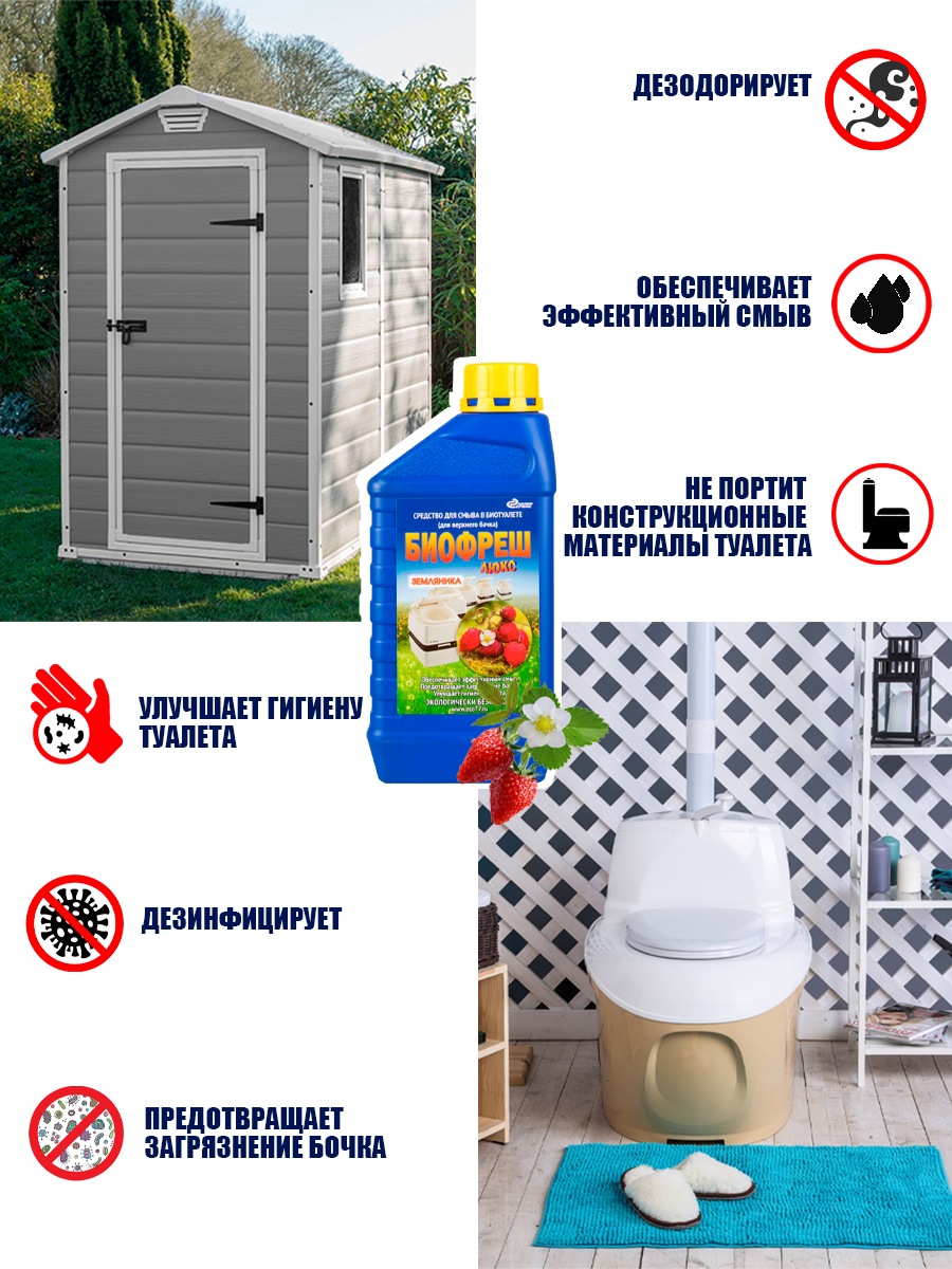Жидкость для биотуалета Биофреш с ароматом земляники - подходит для использования в верхнем бачке биотуалета (со смывной водой). Она играет важную роль в обеспечении комфортного легкого использования и обcлуживания биотуалета.
