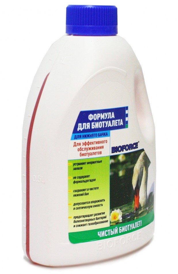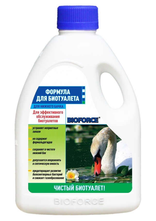 Жидкость для биотуалета ФОРМУЛА BIOFORCE для нижнего бачка. Может применяться как средство для дачного туалета с ведром. Концентрат имеет приятный запах и предназначено для консервации и обеззараживания содержимого нижнего бачка биотуалета или туалетного ведра.