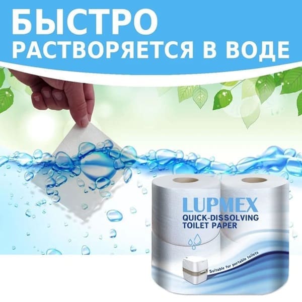 Туалетная бумага для любых видов биотуалетов. Растворяется после использования, в отличие от обычной туалетной бумаги. Благодаря легкой растворимости в принимающем резервуаре со специальной жидкостью, в сливном отверстии туалета не создаются бумажные комья, обычно приводящие к засорам.