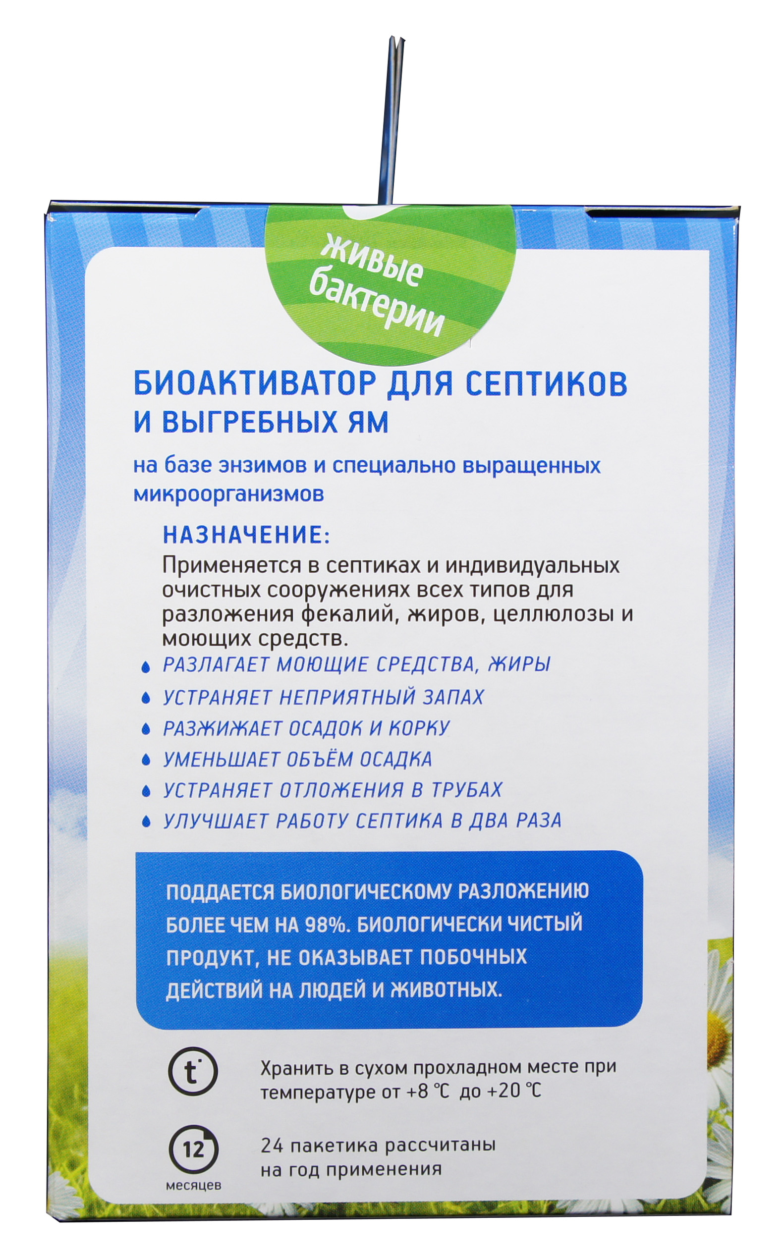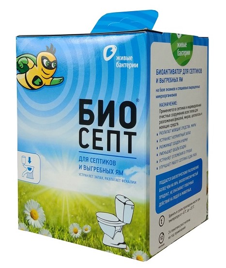 Биосепт - это порошкообразный препарат, состоящий из живых клеток специально подобранных и отселекционированных микроорганизмов, а также ферментов, в сотни раз ускоряющих процессы распада фекалий и трудно разлагаемых соединений, таких как жиры, целлюлоза, поверхностно-активные вещества. В результате практически сразу же исчезает неприятный запах, образуются вода, углекислый газ и минеральный осадок. Поскольку препарат содержит и аэробные и анаэробные бактерии, он применим для конструкций, содержащих и не содержащих кислород