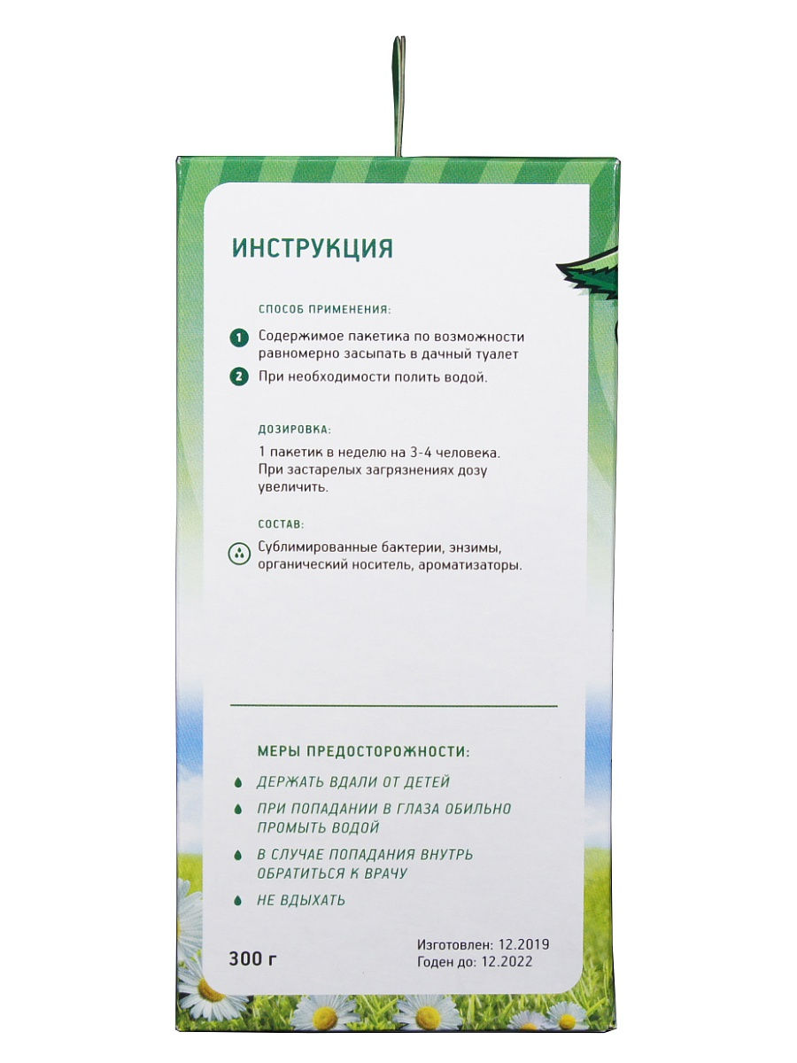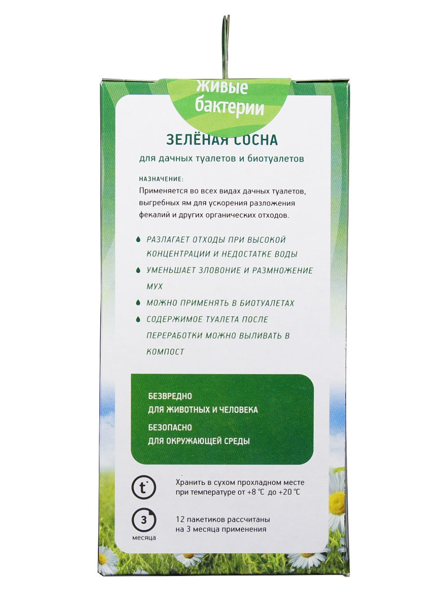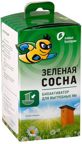 Принцип действия Зеленая сосна очень прост. Необходимая доза препарата засыпается в выгребную яму или дачный туалет. Гранулы препарата напитываются жидкостью и бактерии оживают, начиная расщеплять вязкую массу до состояния жидкости, пригодной для последующего слива в компост. Расчет дозировки Зеленая сосна для емкостей различных объемов подробно указан на упаковке продукта. Примерно раз в неделю нужно досыпать очередную дозу препарата и при необходимости добавлять воду. Высокая концентрация бактерий позволяет обойтись 300 гр. препарата (12 пакетиков) в течение трех месяцев из расчета на 1 куб.м. ем.