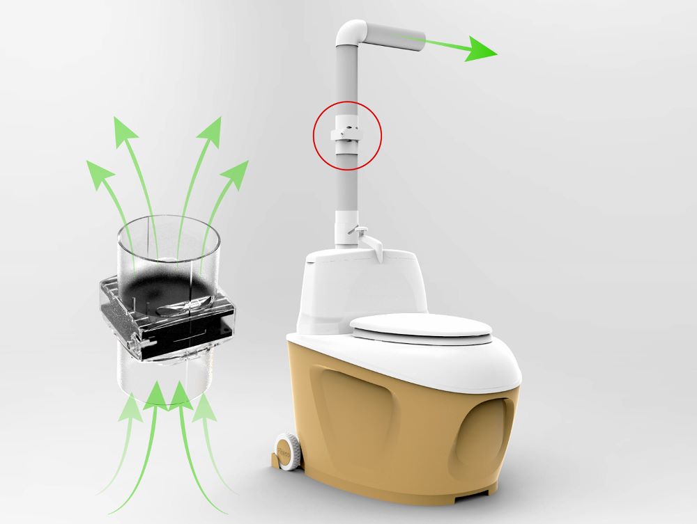После установки туалета все действия, связанные с его обслуживанием, не потребуют двигать туалет с места на место, отсоединять вентиляционный стояк или дренажную трубу – достаточно будет только повернуть специальную муфту (адаптер) вытяжной трубы. Верхнюю часть туалета при этом снимать не обязательно. К месту опорожнения туалет передвигается на колёсах за переднюю ручку.