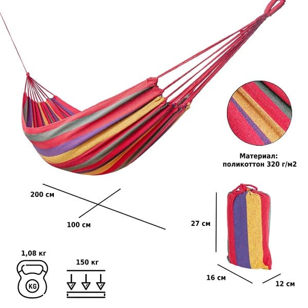 Подвесной гамак Green Glade – это гарантия отличного времяпровождения на свежем воздухе. В тканевом гамаке можно уютно расположиться с любимой книгой в руках, спрятаться от жары в тени деревьев и подремать. А яркая расцветка поспособствуют отличному летнему настроению.