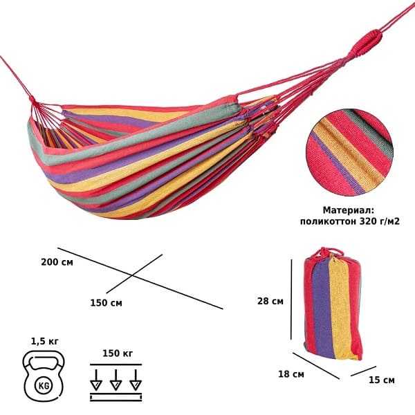 Подвесной гамак Green Glade – это гарантия отличного времяпровождения на свежем воздухе. В тканевом гамаке можно уютно расположиться с любимой книгой в руках, спрятаться от жары в тени деревьев и подремать. А яркая расцветка поспособствуют отличному летнему настроению.