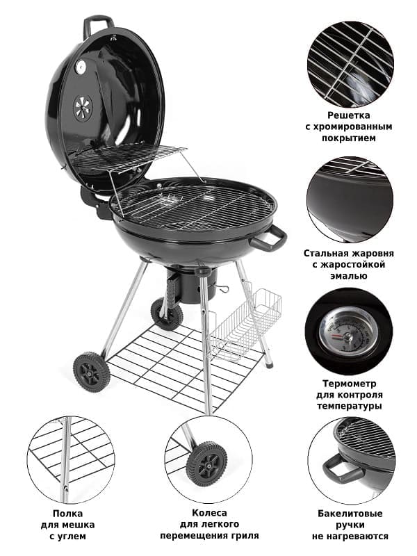Гриль круглого сечения Green Glade AP222. С его помощью можно жарить, коптить или делать гриль. Данная модель обладает компактным размером и удобно разместится в любом уголке садового участка, а благодаря наличию колес ее можно легко перемещать с места на место.
