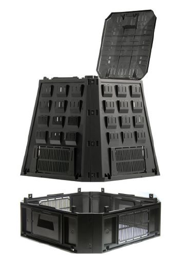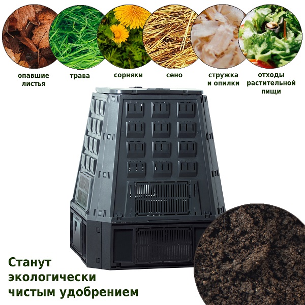 Компостер Prosperplast Biocompo IKEV630C-S411 это пластиковый ящик в форме пирамиды с крышкой и закрывающимся боковым отверстием для извлечения компоста. Он сделан из пластика с учетом всех требований для производства качественного органического удобрения. Компостер держит тепло и имеет отверстия для вентиляции, что значительно ускоряет процесс компостирования. Небольшие отверстия облегчают приток воздуха, а закрытая форма делает невозможным доступ животных к хранящихся отходов. Благодаря откидной створки в нижней части компостера, есть доступ к готовому компосту.