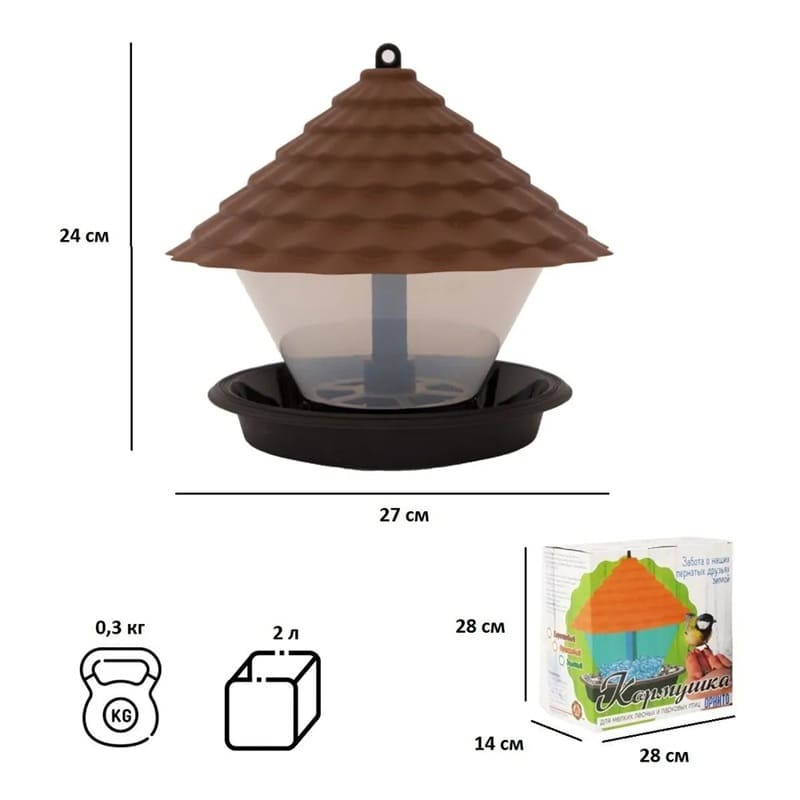 Кормушка уличная для мелких лесных и парковых птиц. Благодаря устойчивости к воздействию ненастной погоды уличную кормушку для птиц можно разместить на даче, в парке, во дворе и в любом другом месте обитания птиц. Изделие выполнено из прочного экологичного пластика и сохраняет корм сухим и чистым, при этом дозируя количество. Также вы можете выбрать удобный вариант установки, например: на шнуре, черенке или даже на земле.