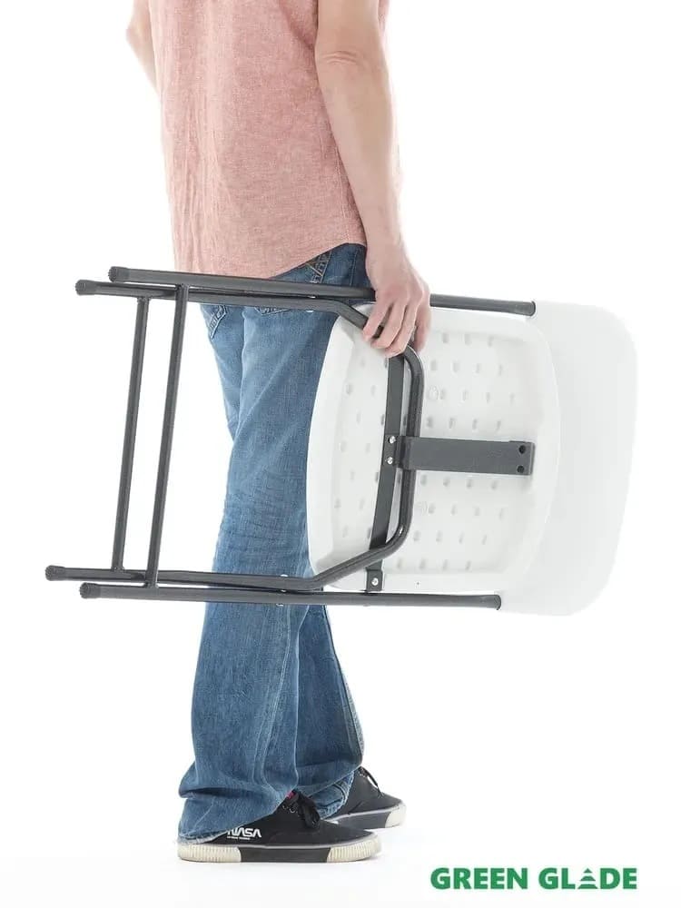 Каркас стальной, сиденье выполнено из пластика и не боится воды. Стул можно быстро и легко сложить. В собранном состоянии занимает мало места, поэтому его удобно как хранить, так и перевозить.