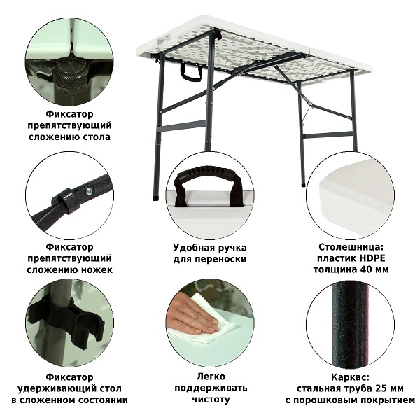Стол складной Green Glade 122 подойдет как для дачи и сада, так и для загородного пикника в кругу семьи или в компании друзей. Стол выполнен из качественного пластика с каркасом из стали. Ножки в разложенном состоянии надежно фиксируются. Его можно сложить в одно движение, и в сложенном состоянии он не займет много места внутри помещения или в багажнике автомобиля. Также складной стол Green Glade 122 имеет удобную ручку для переноски его в сложенном состоянии.