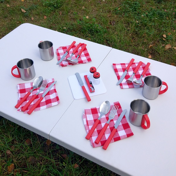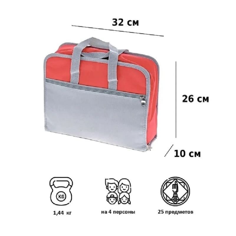 • Количество предметов в сумке на 4 персоны: 25 штук (ножи, вилки, ложки, чашки, салфетки, солонка, перечница, штопор, нож для сыра/масла, разделочная доска)
