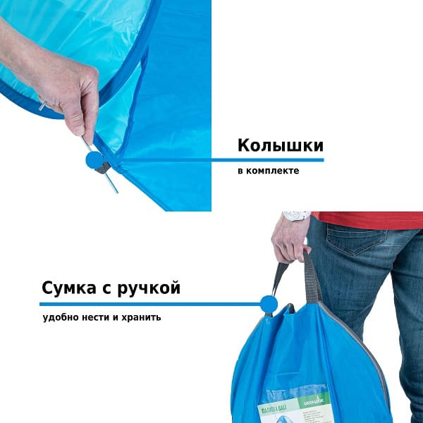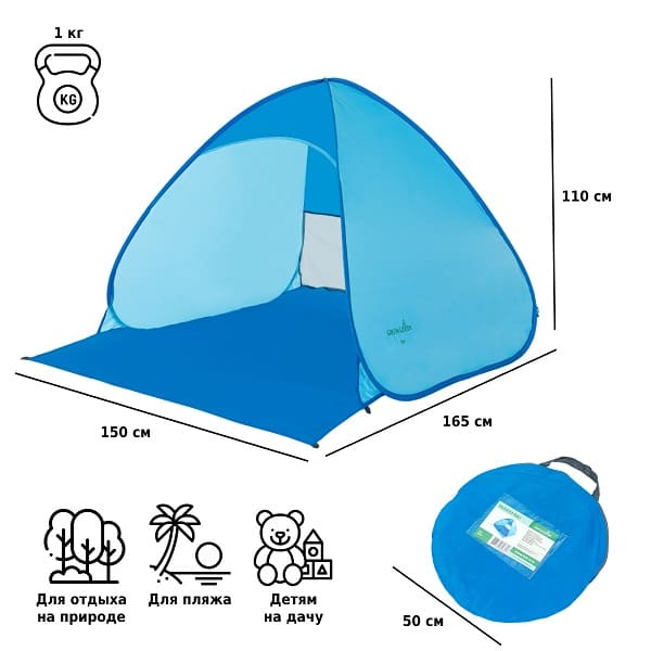 Тент защитит от солнечных лучей в жаркий день. Палатка очень компактная и легкая, поэтому ее удобно брать с собой. Сборка происходит автоматически за несколько секунд.