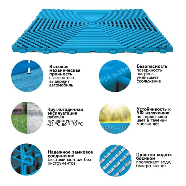 Модульная садовая плитка Helex используется в качестве покрытия на территории загородных участков. Ею можно оформить площадки рядом со стационарными бассейнами или использовать как основание для каркасных и надувных бассейнов. Высококачественный материал изделия обладает противоскользящим эффектом и устойчив как к отрицательным, так и положительным температурам (от -25°C до +70°C). Плитка не выцветает под солнцем и будет радовать яркостью на протяжении многих лет. Отличительной особенностью модульного покрытия Helex является то, что при рассмотрении с разных ракурсов рисунок меняется.