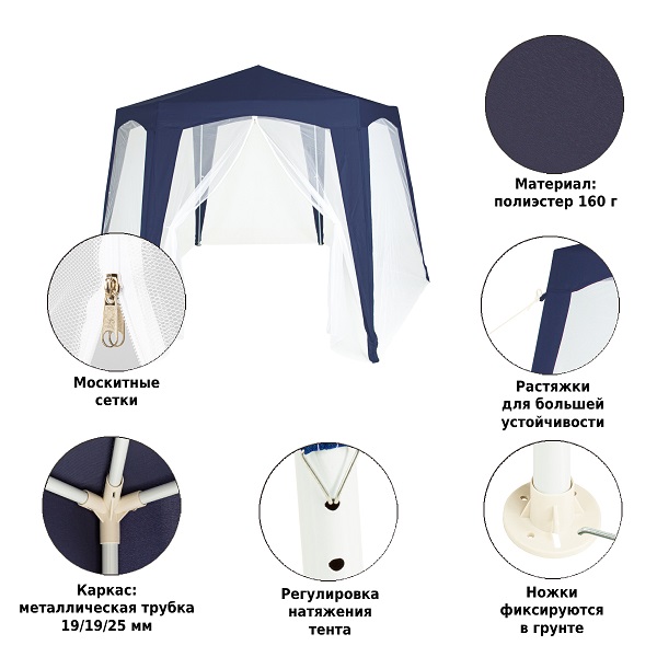 Тент шатер Green Glade 10061 – просторный стильный тент со стенками из москитной сетки. Он имеет легкий, но прочный каркас из металлической трубки. Тент выполнен в виде классического шатра (шесть стенок шириной по 2 метра). В центре купол имеет высоту 2,6 метра. Покрытие тента – полиэстер плотностью 160 г/м.