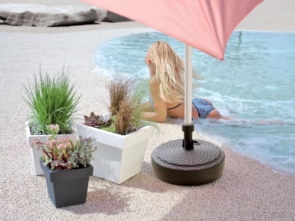 Основание для зонта Umbrella Base из пластика – это надежная и прочная подставка для садовых зонтов, незаменимая в различных поездках, на садовом участке, пляже, в кемпинге. Оно используется с целью установки зонта на ровной поверхности. В основании подставки есть специальная выемка для фиксации зонта. Внутри есть полость для заполнения песком или водой, чтобы утяжелить конструкцию. Благодаря небольшому весу основание для зонта Umbrella Base можно брать с собой, так как оно не займет много места.