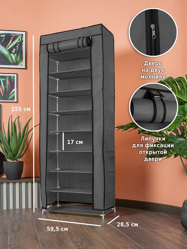 Высокая и узкая обувница шкаф HELEX Home – это многоярусная закрытая стойка с полками для обуви. Благодаря большой вместительности и выдерживаемой нагрузке в 20 кг, такую вешалку обувницу можно использовать не только для хранения обуви, но и других вещей. Обувница узкая, всего 30 х 60 см, поэтому не займет много места в коридоре или прихожей. При этом стойка для обуви высокая, имеет девять ярусов, что позволяет разместить 27 пар и решить вопрос хранения обуви в доме. Закрытая обувница шкаф выполнена из легких металлических труб, полки и дверь-занавес - из высококачественного нетканого материала высокой плотности. Собирается быстро и просто.