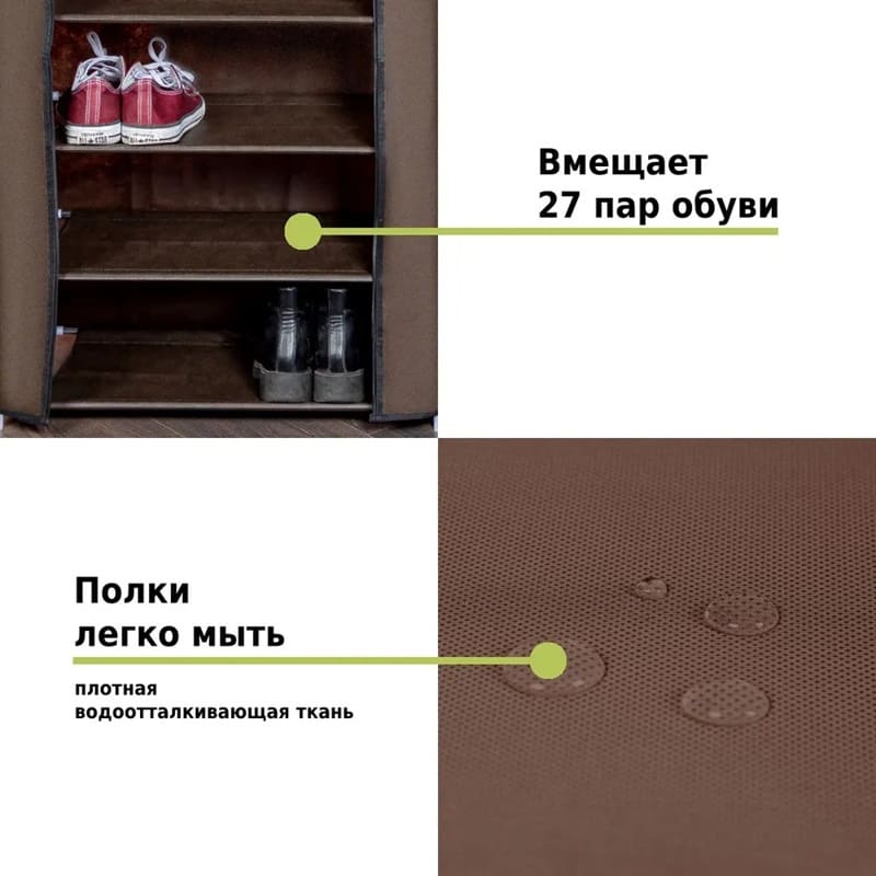 Высокая и узкая обувница шкаф HELEX Home – это многоярусная закрытая стойка с полками для обуви. Благодаря большой вместительности и выдерживаемой нагрузке в 20 кг, такую вешалку обувницу можно использовать не только для хранения обуви, но и других вещей. Обувница узкая, всего 30 х 60 см, поэтому не займет много места в коридоре или прихожей. При этом стойка для обуви высокая, имеет девять ярусов, что позволяет разместить 27 пар и решить вопрос хранения обуви в доме. Закрытая обувница шкаф выполнена из легких металлических труб, полки и дверь-занавес - из высококачественного нетканого материала высокой плотности. Собирается быстро и просто.