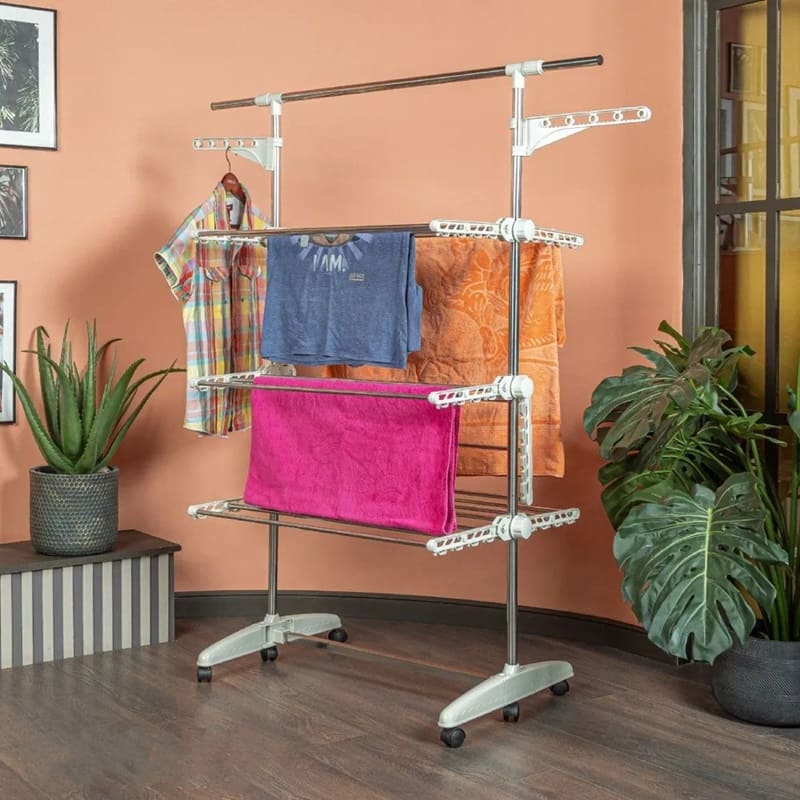 Имеет три яруса для сушки белья, дополнительные крючки позволяют сушить одежду прямо на плечиках, имеется подставка для обуви. Благодаря колёсикам в комплекте, сушилка очень мобильная, ее можно легко переместить с одного места на другое. Ярусы для сушки складные, поэтому сушилка не будет занимать много места.