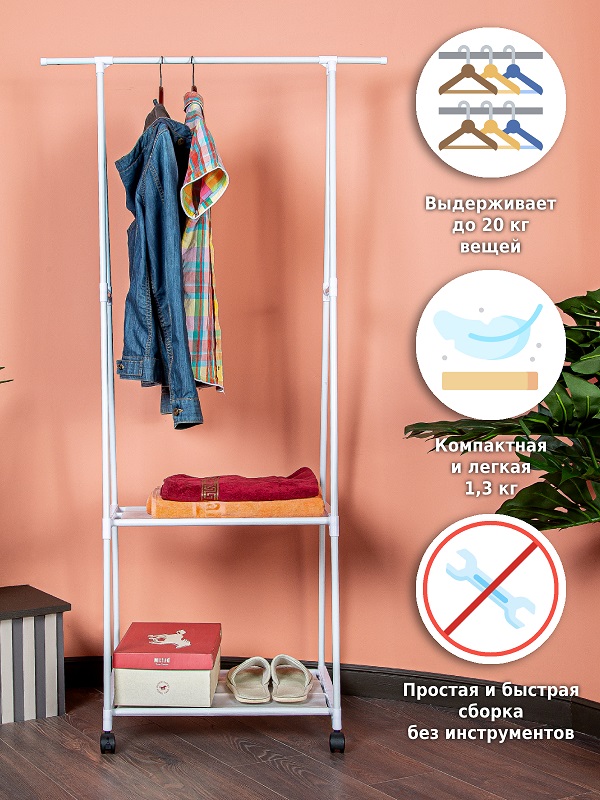 Напольная вешалка для одежды станет современной заменой шкафу и поможет в хранении самых разных вещей. Она организует пространство в прихожей, детской, гардеробной, спальне, коридере, ванной комнате или на балконе. Стойка перемещается на пластиковых колесиках, она передвижная и многофункциональная.На перекладину помещается больше 10 плечиков с брюками, юбками, рубашками, штанами, футболками, шарфами, платками и верхней одеждой. А под штангой есть большая полка для хранения обуви в чехлах и полочка для сумок и органайзеров для белья.