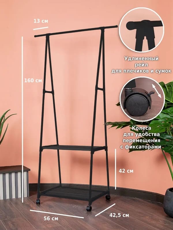 Напольная вешалка для одежды станет современной заменой шкафу и поможет в хранении самых разных вещей. Она организует пространство в прихожей, детской, гардеробной, спальне, коридере, ванной комнате или на балконе. Стойка перемещается на пластиковых колесиках, она передвижная и многофункциональная.На перекладину помещается больше 10 плечиков с брюками, юбками, рубашками, штанами, футболками, шарфами, платками и верхней одеждой. А под штангой есть большая полка для хранения обуви в чехлах и полочка для сумок и органайзеров для белья.