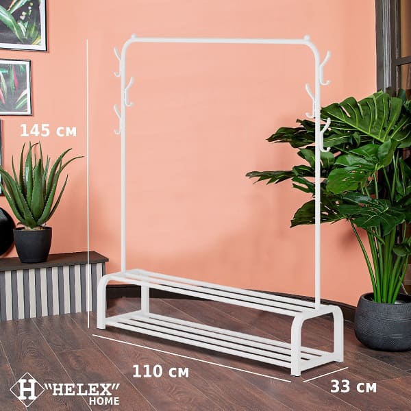 Напольная вешалка для одежды HELEX Home – это устойчивая, вместительная и надежная комнатная мебель. Благодаря этой вешалке органайзеру вся ваша повседневная одежда будет всегда под рукой. Несмотря на ее компактность открытая вешалка стеллаж - высокая и достаточно вместительная, чтобы хранить на ней необходимую одежду в развешенном или аккуратно сложенном состоянии.
