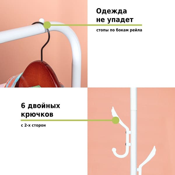 Благодаря тому, что вешалка стойка высокая, компактная и не занимает много места, ее можно разместить в коридоре, прихожей, комнате, спальне, гардеробной, детской и на кухне, т.е. так, чтобы хранимая на ней одежда была всегда под рукой.